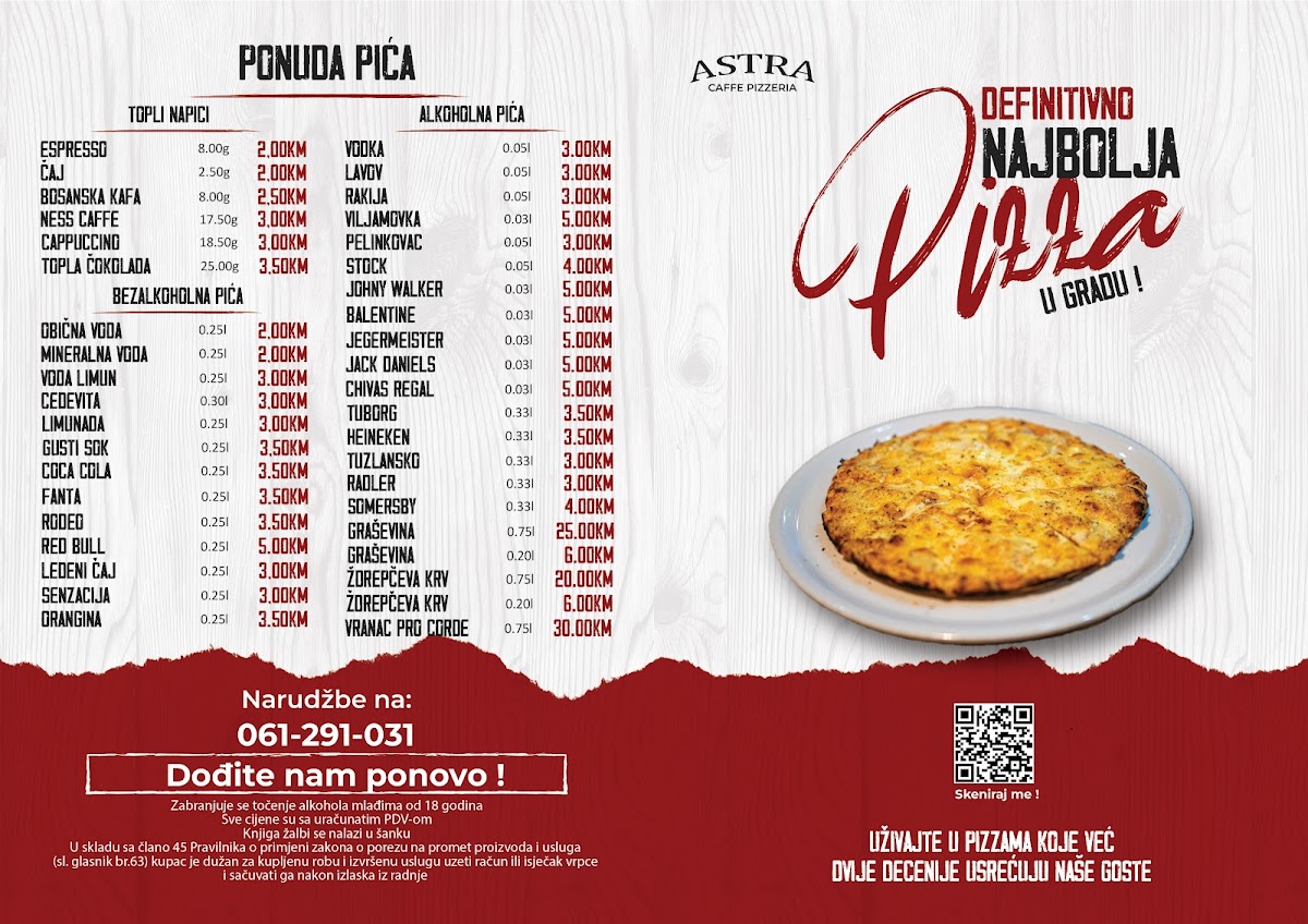 For inquiries or to place an order, you can reach them at +387 61 291 031. Experience the flavor, warmth, and hospitality at Caffe Pizzeria Astra; it's a slice of comfort that you won't soon forget.
